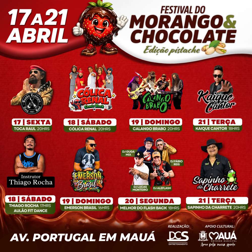Realizado pela DCS Entretenimento, com apoio cultural da Prefeitura de Mauá, o festival traz uma proposta especial que combina o sabor do morango com o chocolate e o pistache, em uma variedade de pratos e doces que prometem agradar todos os públicos.